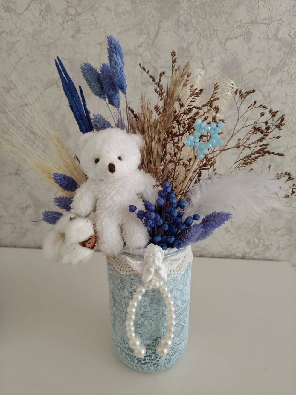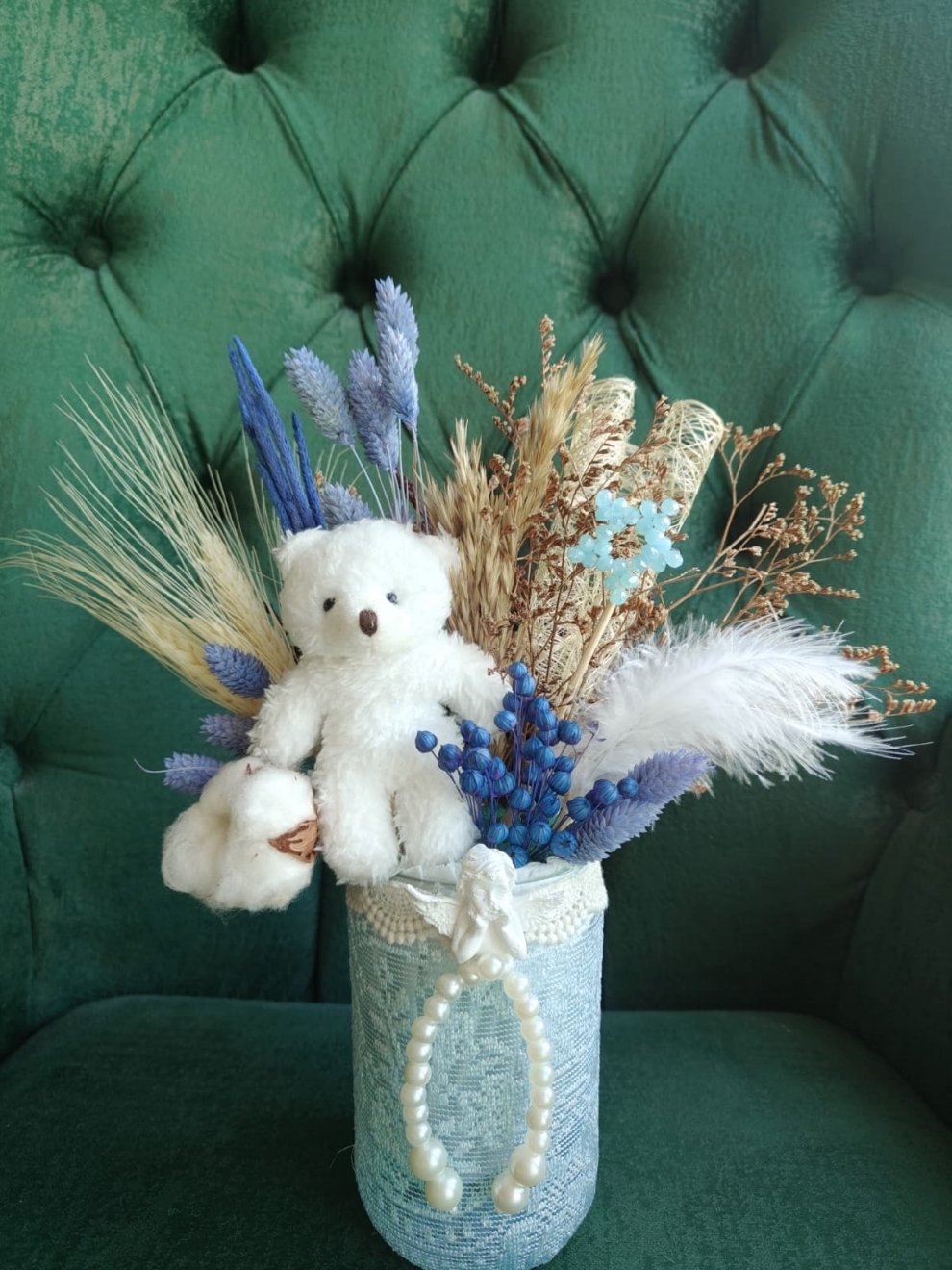Bir masumiyet ve huzurun hikayesi, Ayıcıklı mavi kuru çiçek aranjmanı. Yumuşacık beyaz ayıcık, doğal kuru çiçekler kuş tüyleriyle ,doğal pamuk ve incilerden hazırlanmış bu özel kuru çiçek aranjmanı yeni bir başlangıcı kutlamak veya sevdiğinizin yüzünde tatlı bir tebessüm oluşturmak için idealdir.