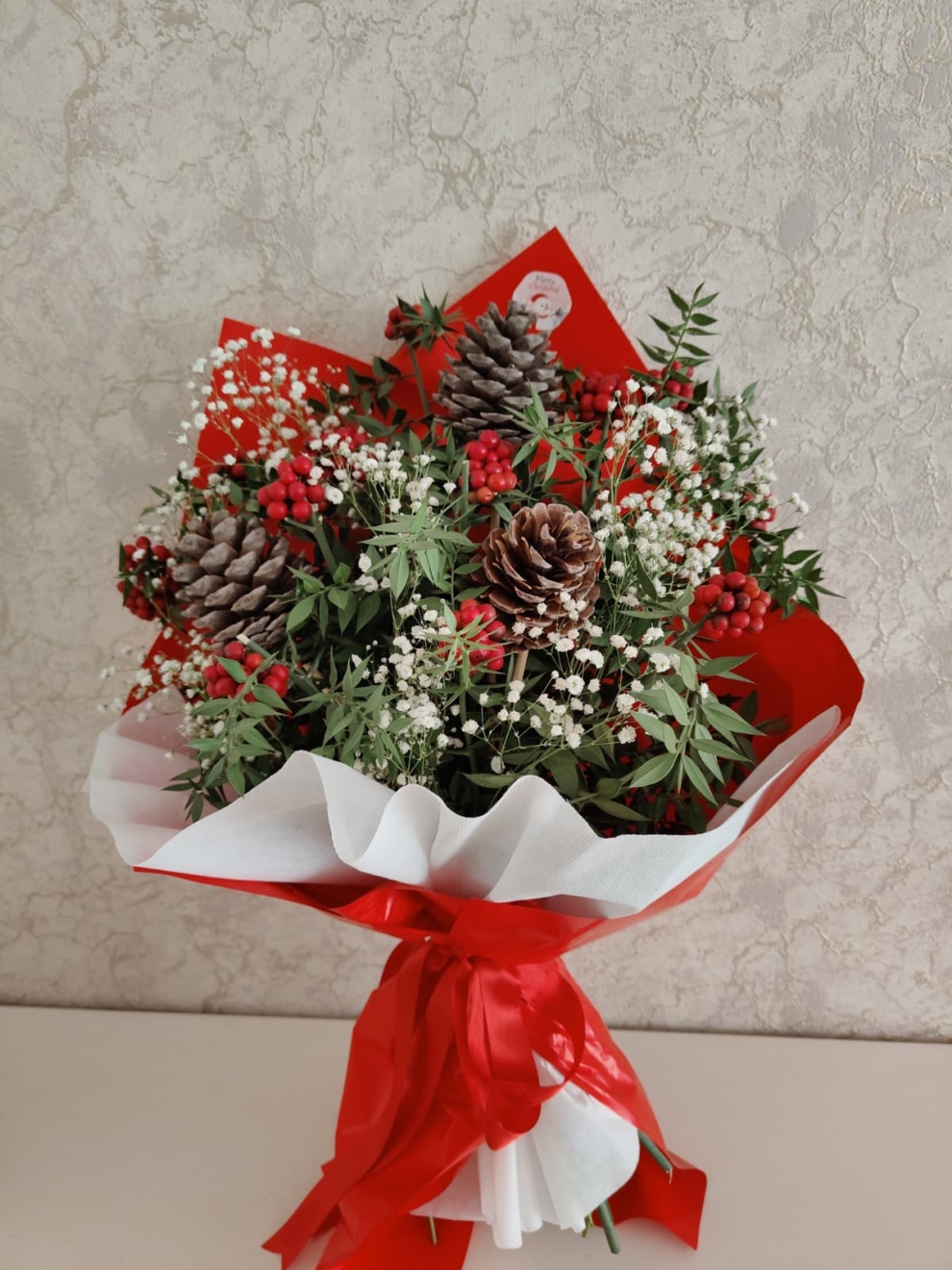 Yeni yıl coşkusunu, geleneksel bereket simgesiyle birleştitrerek sevdikllerinize gönderin. Canlı kırmızı kokina meyveleri, kar taneleri gibi narin cipso çiçekleriyle buluşuyor. doğal kozalak ile birleştirilen bu buket, kırmızının enerjisi ile beyazın masumiyetini mükemmel bir kontrastla birleştirerek kış aylarının en neşeli ve anlamlı hediyesini sunar.