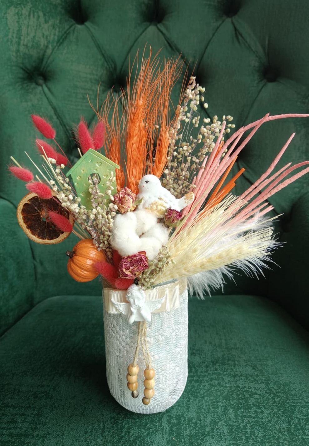 Doğanın sıcak tonlarını sevdiklerinize taşıyın. Canlı kuru çiçeklerin, kuş evinin ve sevimli bir kuşun detayı birleşerek bakmaya doyamayacağınız rustik bir atmosfer sunar. Dantelden hazırlanmış özel vazo, melek objesiyle zenginleştirilmiştir.