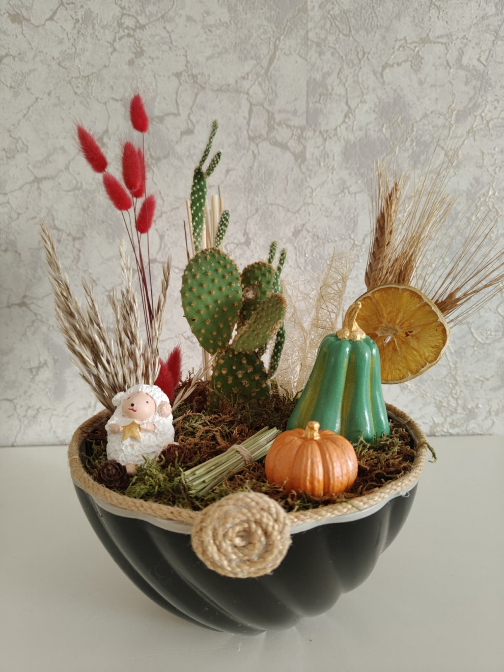 Doğanın en dayanıklı ve sevimli üyelerinden olan kaktüs. Bu özel tasarım teraryum aranjmanı, kaktüsün yanında yer alan sevimli kuzu figürü, iki farklı formda balkabağı ve kurutulmuş çiçekler ile eşsiz bir konsept oluşturuyor. Bakımı zahmetsiz bu aranjman, mutluluk hediye etmek için idealdir.